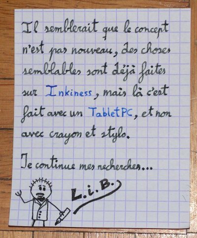 Il semblerait que le concept n'est pas nouveau, des choses semblables sont déjà faites sur Inkiness, mais là c'est fait avec une Tablet PC, et non avec crayon et stylo.