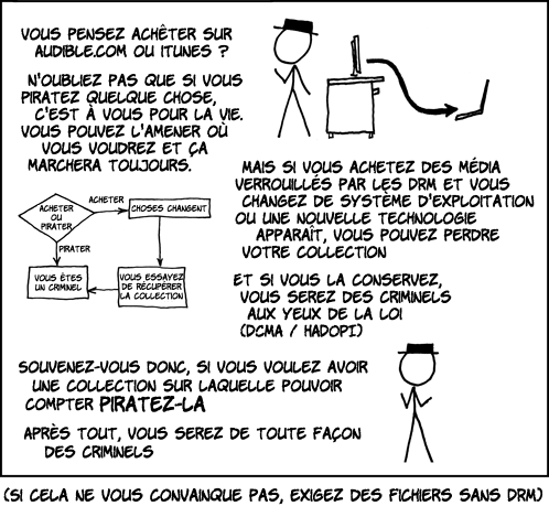Je pourrais continuer pendant longtemps à donner des arguments contre ces DRM qui ne font que pénaliser les personnes qui dépensent leur argent dans les média que ces DRM sont censés protéger, mais je trouve que la dernière planche de XKCD le fait beaucoup mieux que moi :