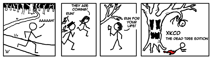 Ces derniers jours j'ai regardé pas mal de films de zombies, donc les trois Resident Evil et l'excellente série Dead Set. J'imagine que c'est à cause de ça que lorsque j'ai lu que XKCD allait avoir une Dead tree edition 2 j'ai pensé à des arbres zombies (dead trees) qui s'attaquaient aux personnages de XKCD.