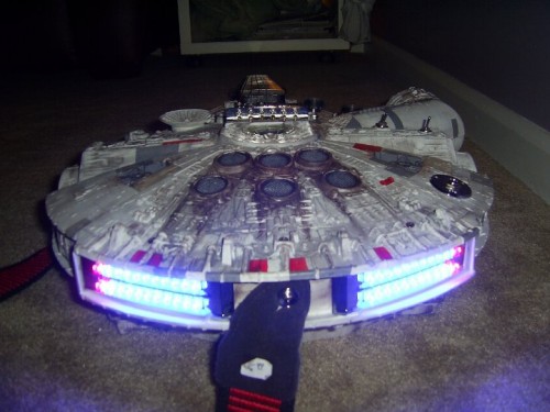 Les lumières sont faites avec des LEDs, dont l'alimentation est fournie par des piles cachés à l'intérieur du Faucon.