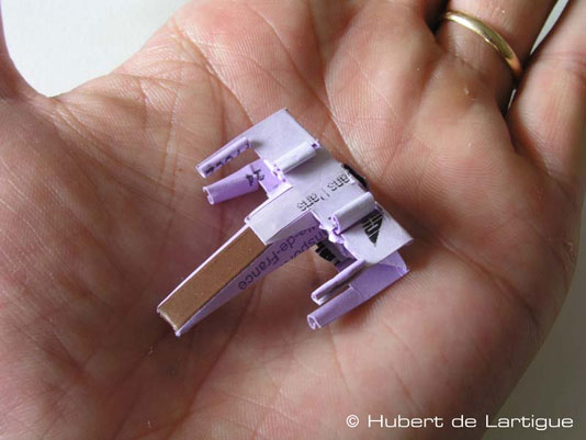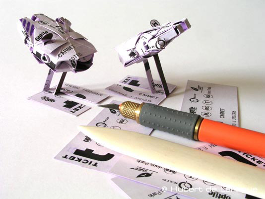 Comme Hubert raconte sur son site, tout a commencé en 2004 lorsqu'il s'est mis à se demander comment donner une forme intéressante à un ticket de métro. Après des innombrables essais (six mois de trajets en métro), le résultat était à la hauteur, un superbe X-Wing obtenu en découpant et pliant deux tickets de métro (le montage se fait sans colle) :
