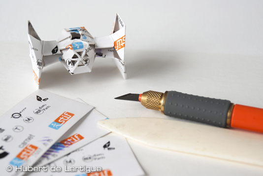 Je trouve excellent qu'Hubert ne se limite pas à fabriquer ses vaisseaux mais qu'il prenne du temps de rédiger des superbes tutoriels* illustrés, expliquant en détail comment faire soi même ces bijoux d'origami geek. N’hésitez pas à aller sur son site et essayez de donner une nouvelle vie à vos tickets de transport en commun.