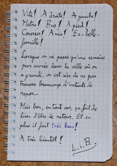 Là-bas je serai encore moins connecté qu'ici, on n' même pas de téléphone à la maison. Je ne sais donc pas quand est-ce que je posterai les prochain billets, mais il y aura plein de photos et de billets au crayon.